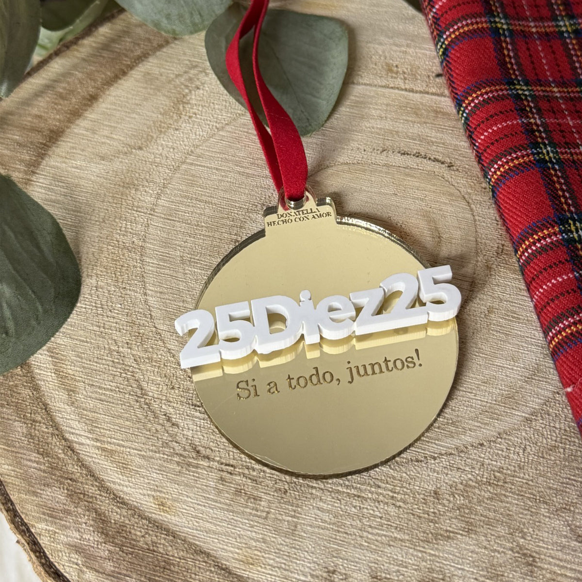 Bola de metacrilato dorada con grabado y palabra en relieve blanco