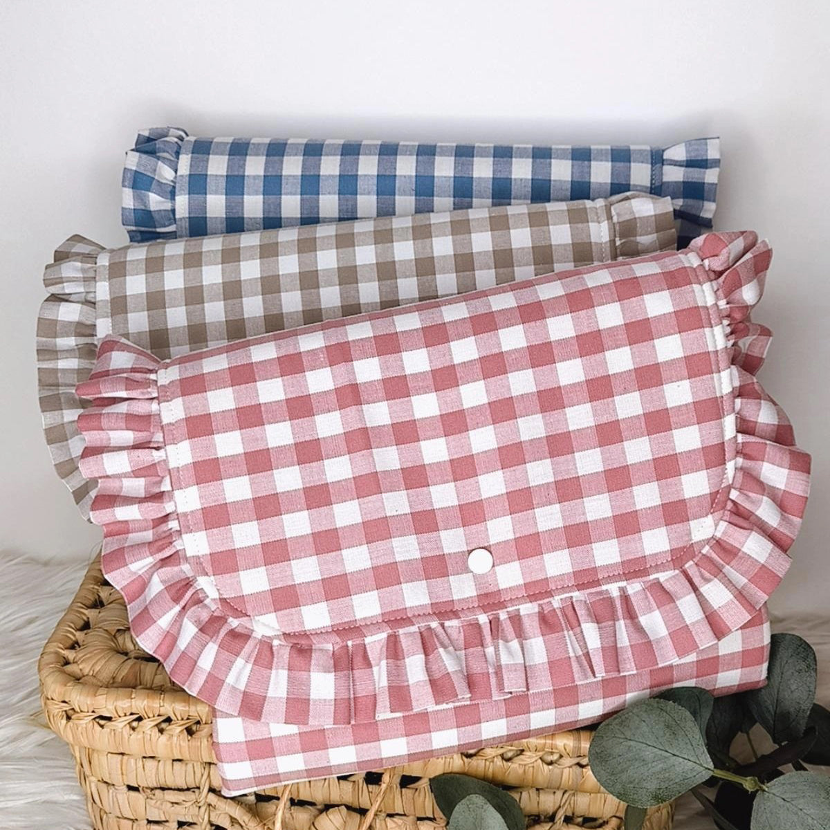 Nuestro cambiador portátil para bebés está confeccionado en suave tela vichy 100% algodón, con un delicado volante decorativo que le aporta un toque único y elegante. Puedes personalizarlo con el nombre de tu bebé, convirtiéndolo en un accesorio exclusivo y perfecto para regalar.