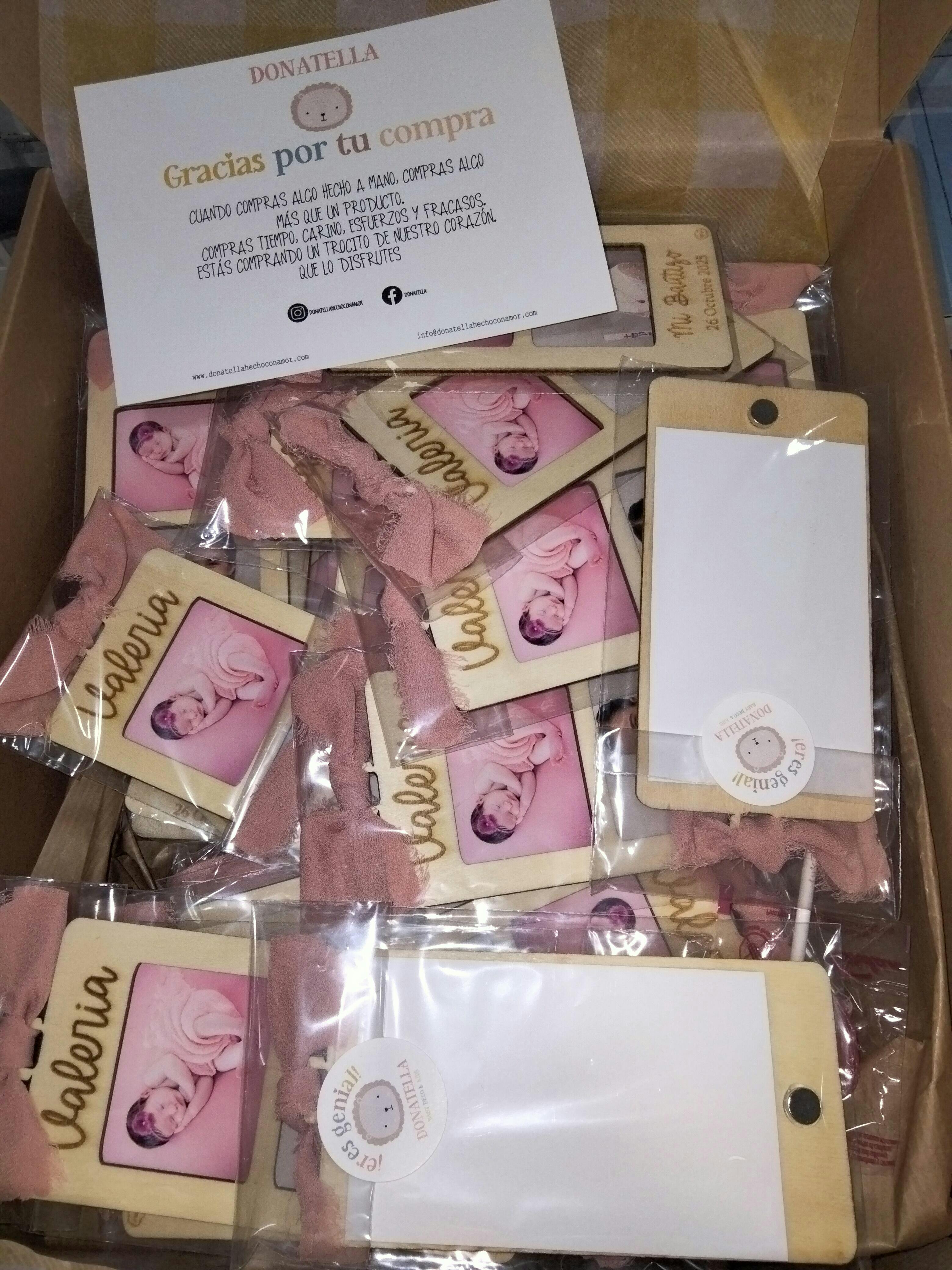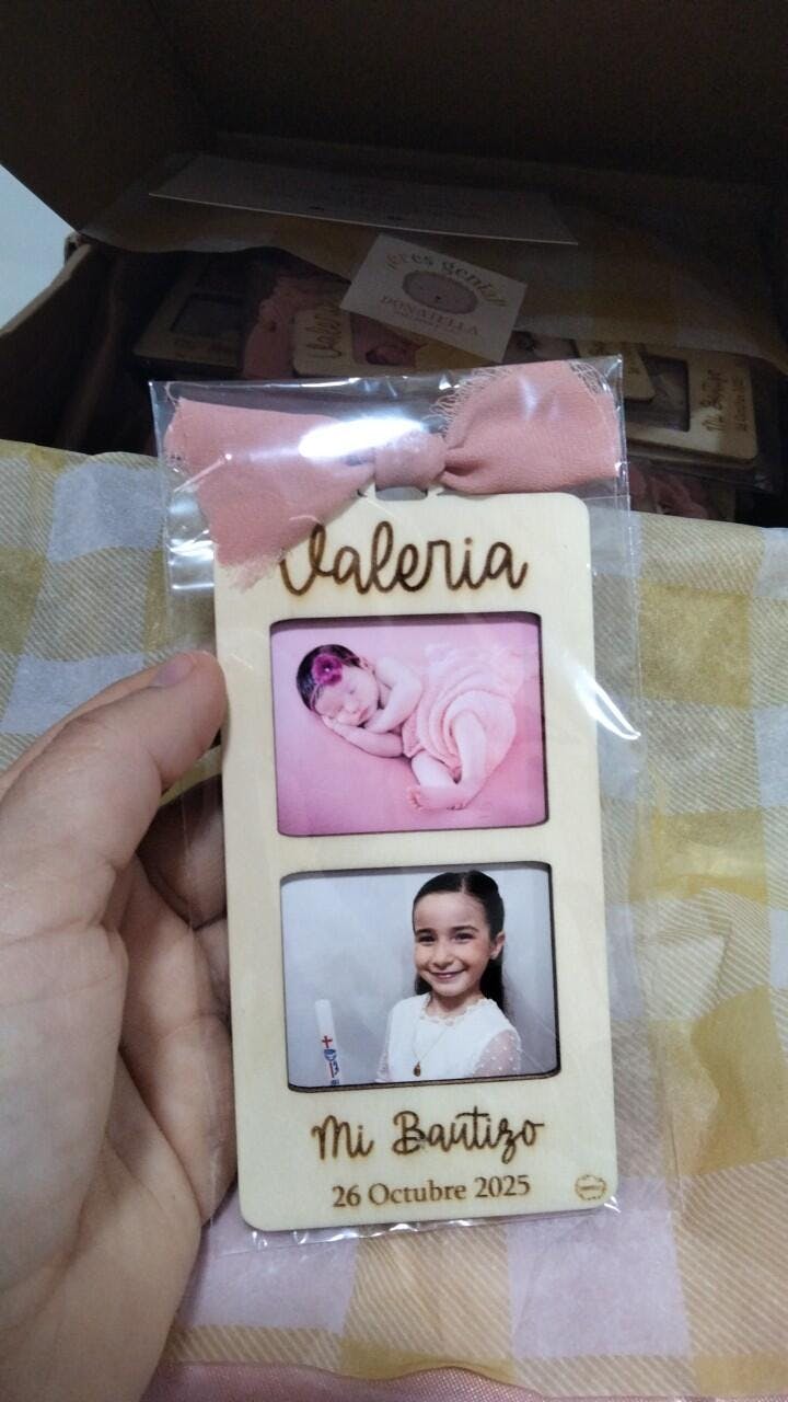 Esta realizado en madera de 3mm y lleva incluido dos fotos del anfitrión de la fiesta. El lazo es de seda y puedes escoger entre rosa empolvado como en la foto, beige, celeste y verde mint. Lleva un imán en la parte trasera para poder darle doble utilidad.