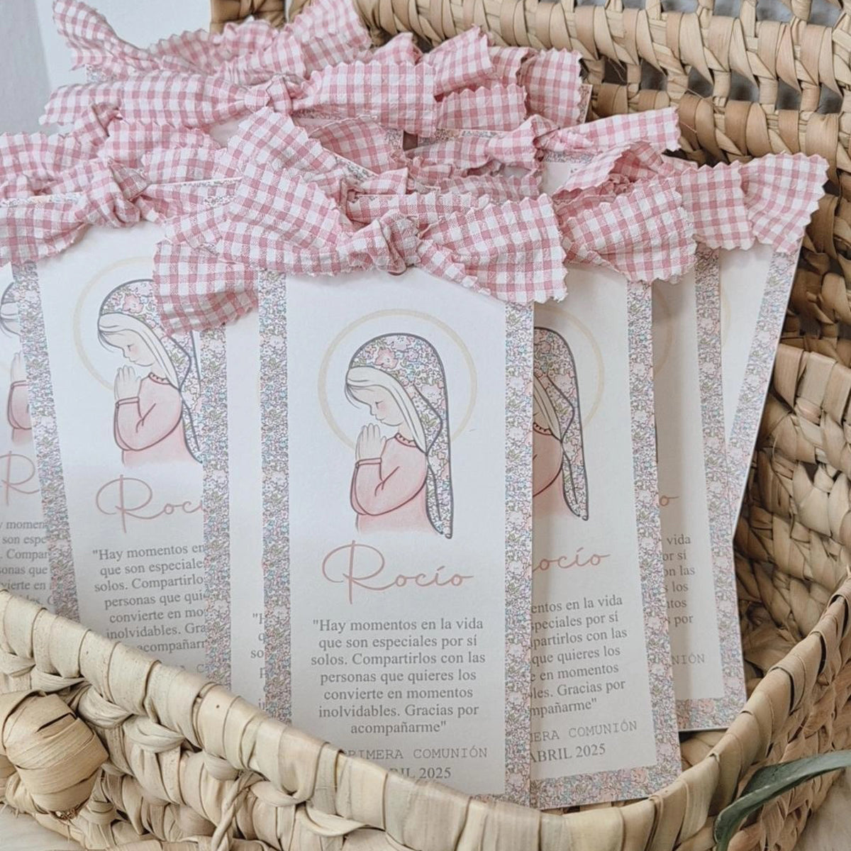 Mínimo 15 unidades. Se puede cambiar las flores y lazada por cuadros vichy en celeste o beige y adaptarlo a cualquier evento.